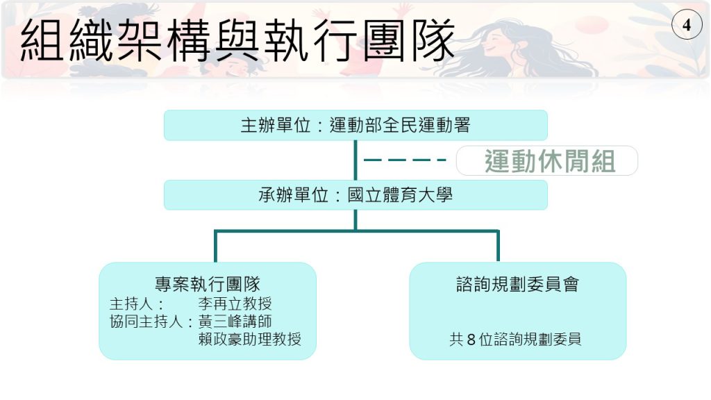 運動部及全民運動署於114年9月9日掛牌成立,運動部為主管全國運動業務之最高行政機關,致力於提倡全民運動風氣、強化選手培育及權益保障、推動運動產業發展、推展國際運動事務,並強化適應運動發展。全民運動署為落實推動「提倡全民運動,增進國民健康」之核心目標,將運動融入日常生活之中,促使國民養成規律運動習慣,以形塑運動文化、強化體適能、促進運動健康、推動社區運動發展、保障全民運動權利、提升民眾參與運動之可及性及便利性,提升全民運動風氣及精進各類型運動發展;基此,