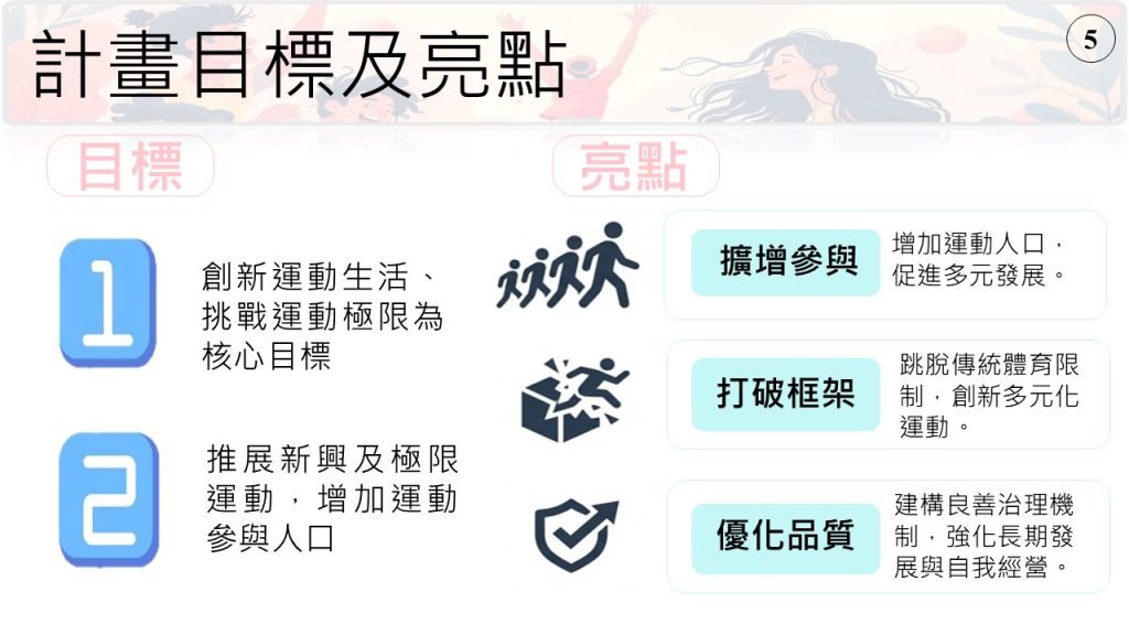 本計畫以「創新運動生活、挑戰運動極限」為目標,推展新興及極限運動,增加運動參與人口。